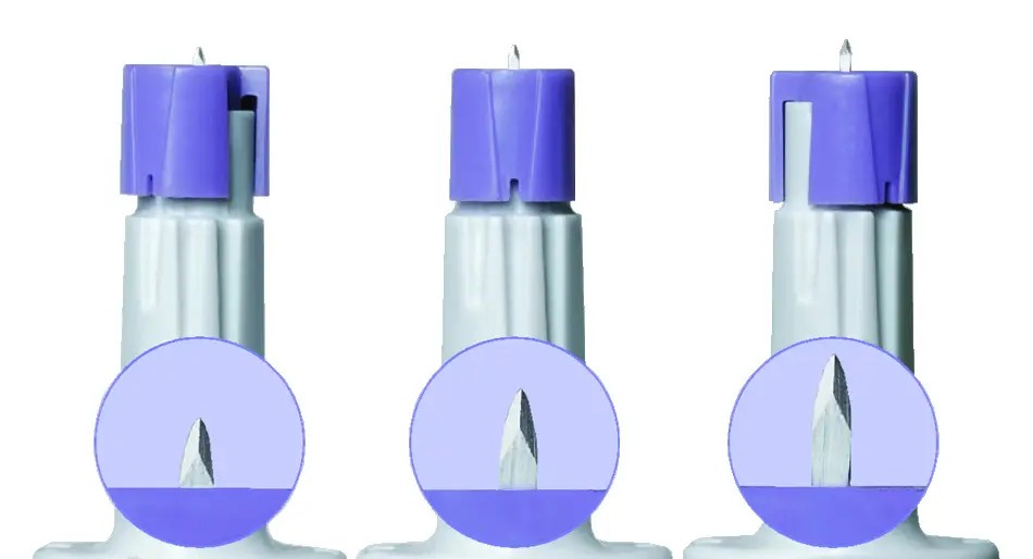 - Easy Activation: A firm press of the purple trigger button activates the device. The trigger sits high when unused and lowers after activation to indicate the lancet has been used
