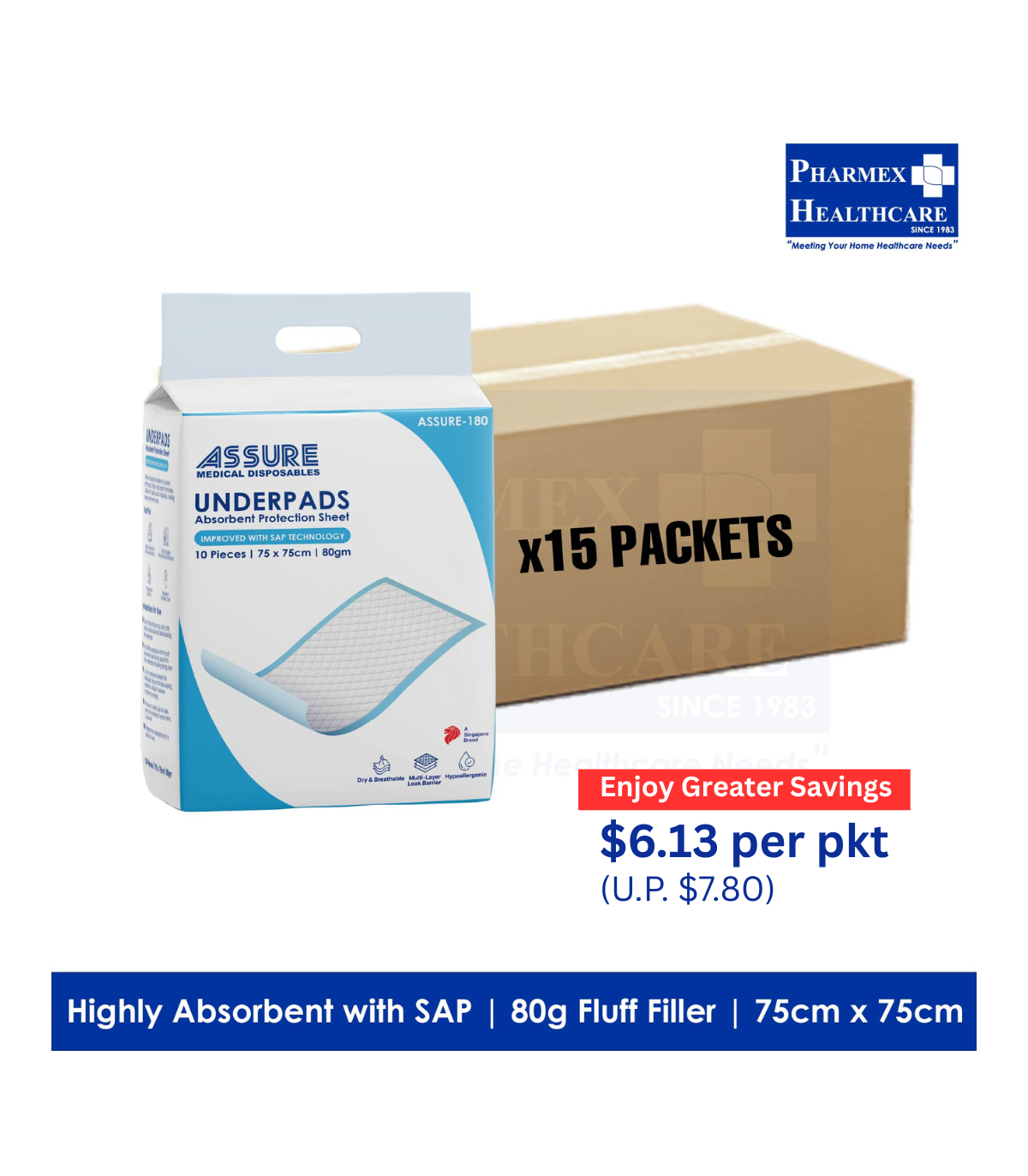 ASSURE Underpads with SAP, 75cm x 75cm, 80gm Fluff Filler