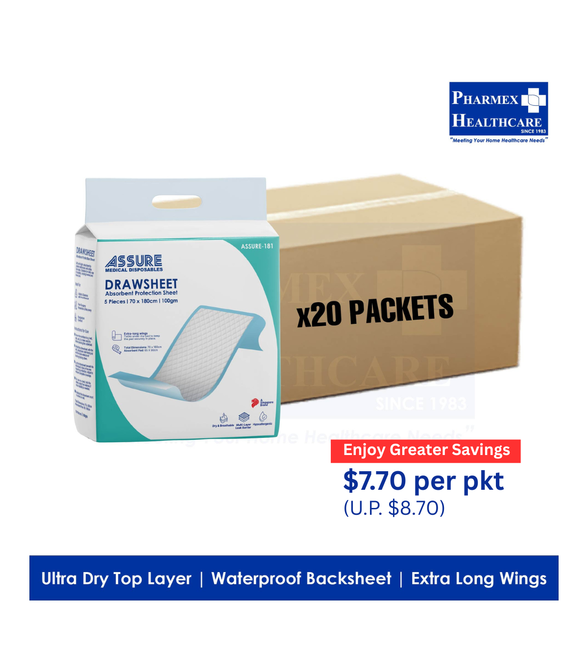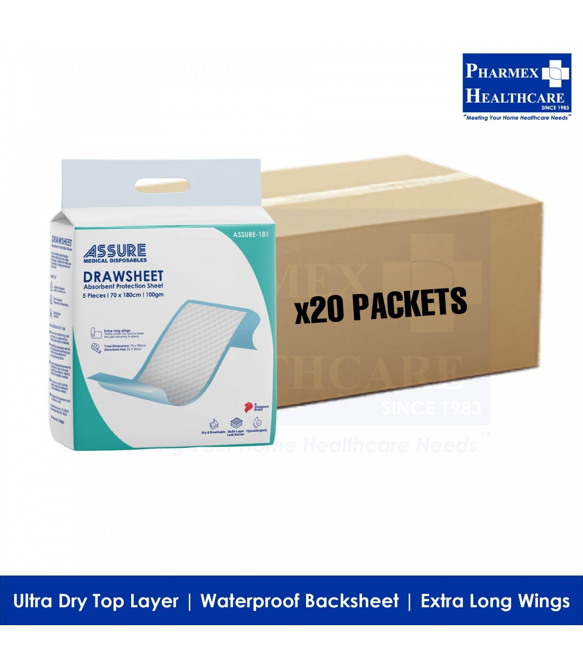 Comes with larger dimension and pad size, you can keep your beds, chairs, furniture & other surfaces clean and dry with ASSURE Underpads Draw Sheet (70cm x 180cm).